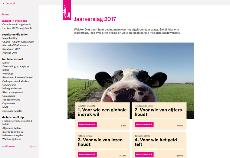 We built a platform for De 9 Straatjes, designed annual reports for Wakker Dier, made statistics on social and physical issues and safety exciting for the municipalities of Rotterdam and Almere & created banners for ING that run on ATMs.
